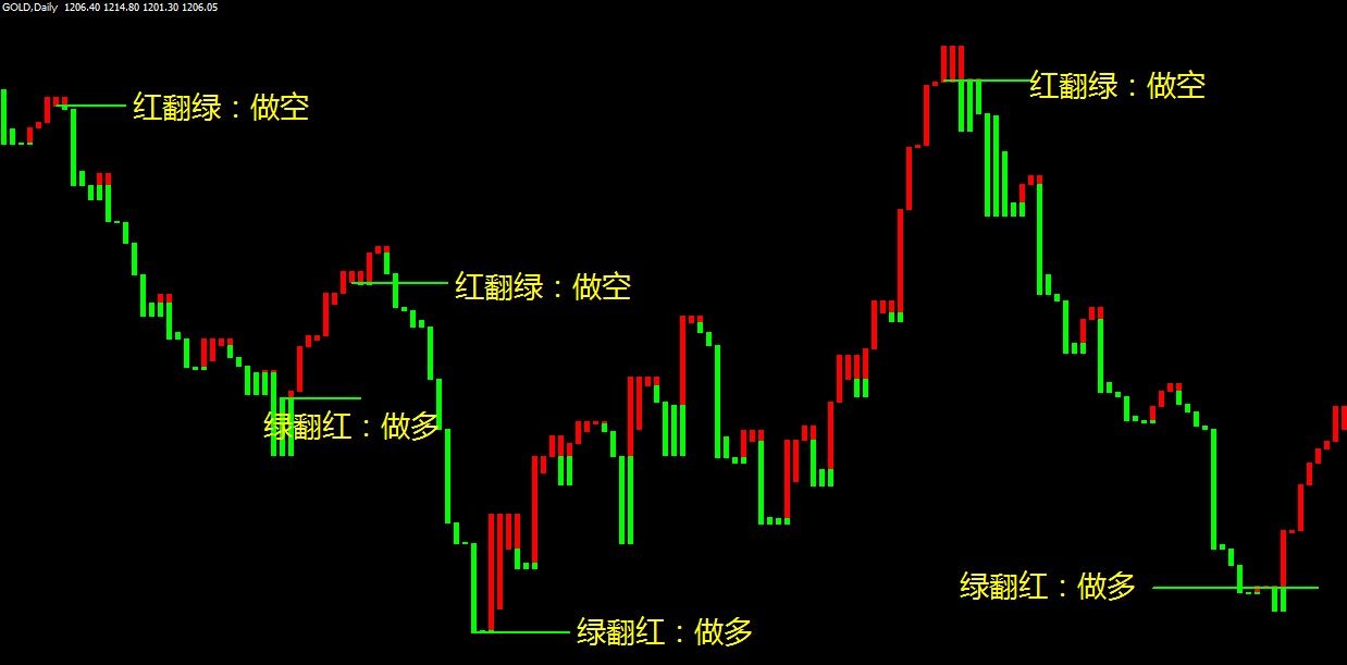 宝塔线以白(或红)黑(或绿)的实体棒线来划分价格的涨跌,要通过棒线翻红或翻绿的变化情况来以研判价格未来的涨跌趋势,是外汇操盘手必备操盘工具。